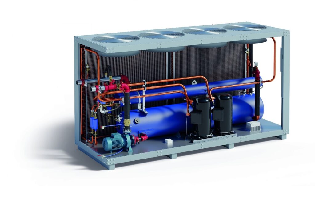 Працює як стандартний парокомпресійний чиллер (з компресором, конденсатором, випарником і холодоагентом).